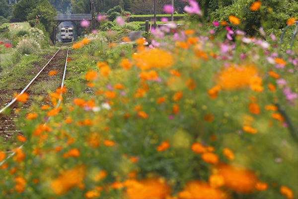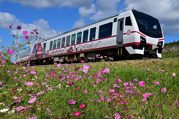 秋晴れの下、コスモスが咲く釜石線を駆け抜ける「ひなび」。