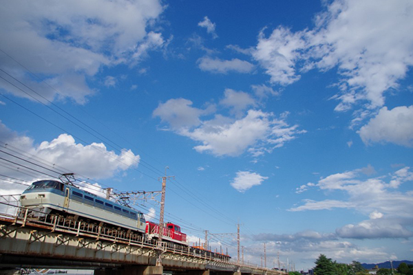 秋晴れの下、EF66とDD200、チキ2両の”サメ御一行”が仲良く吹田を目指す。