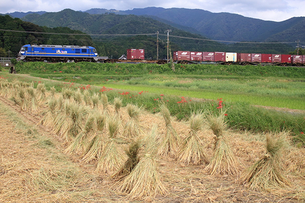 おばあちゃんがせっせと作った藁こづみ、その側を貨物列車がゆく秋の風景。
