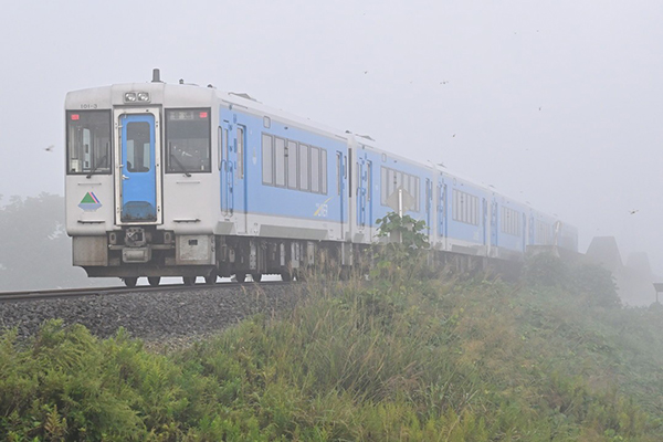 幻想的な濃霧の早朝、普段通りにキハ101が6両で通過しました。