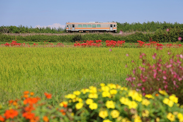 ●秋花咲き乱れる伊勢平野のなかを、ステンレス列車がキラリと輝きながら、ゆっくり走り抜けてゆきました…。