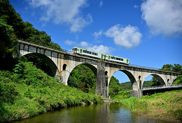 ●新型車両「HB-E220」導入により置き換え予定のキハ100系がめがね橋を渡る。