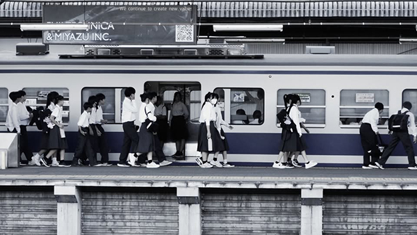 ●試験中なのか少し早めの下校でしょうか。多くの学生たちが列車に乗り込んでいきました。モノクロームでニュートラルに表現してみました。