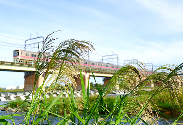 ●秋らしい高い雲とススキが輝く多摩川の河川敷。