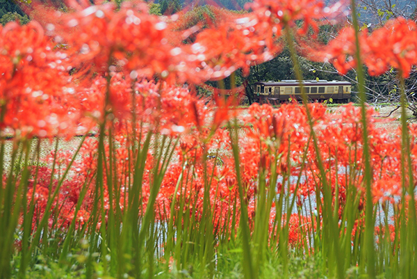 ●一週間ぶりに訪れてみると、蕾も咲きそろった彼岸花がぎっしりと咲いていました。その隙間から向こうを走る列車を覗いてみました。