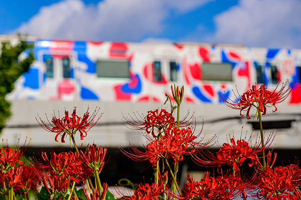 ●街の彼岸花、そして高架を行くミャクミャクカラー。このラッピングも間もなく終了!