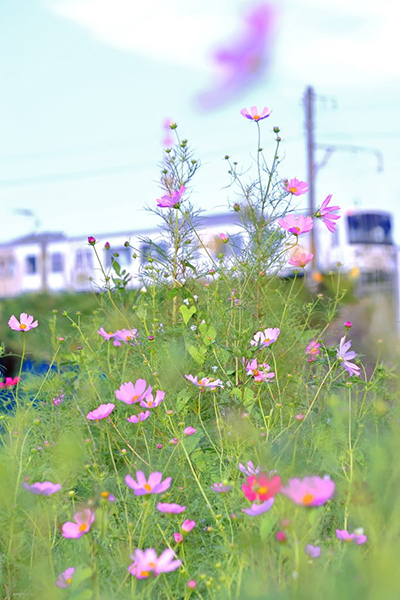 まだまだ暑い日々もあるなか、季節を告げる様に秋桜が咲き始めています。ひつじ電車も秋の風に気持ちよさそうです。