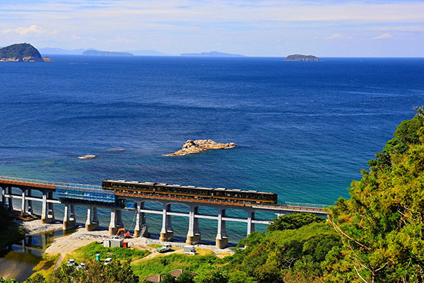 観光列車「はなあかり」が、通過までは曇り空でしたが、雲がのけて青空が姿を見せました。工事中の惣郷川橋梁ですが、青い空と海は素晴らしいです。