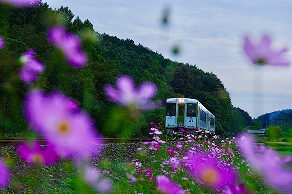 八高線非電化区間で長年走り続けたキハ110系はもうすぐハイブリッド方式新型車両に置き換えられます。線路際に咲くコスモスが秋風に揺られて、このシーンで最後の花道と思いを込めてシャッターを切りました。