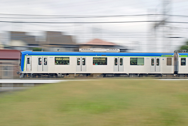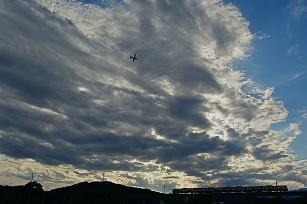 ●飛行機をワンポイントに、西の空から流れくる雲の下、川越行き電車が通り過ぎて行く。