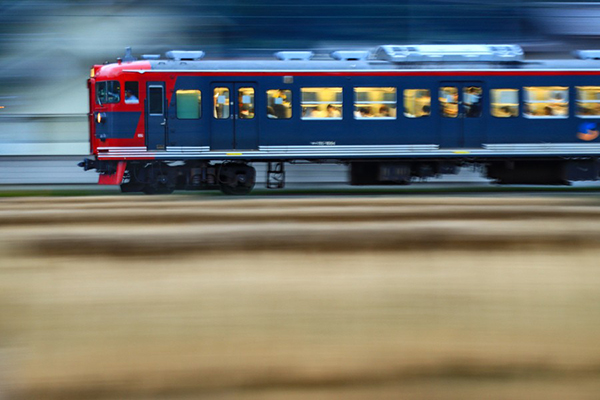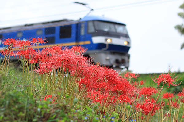 雨粒を纏った美しい彼岸花の側を青の機関車が駆けてゆきました。