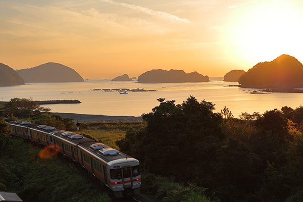 日の出にあわせて、波静かな太平洋沿いを走りゆく上り始発列車…。