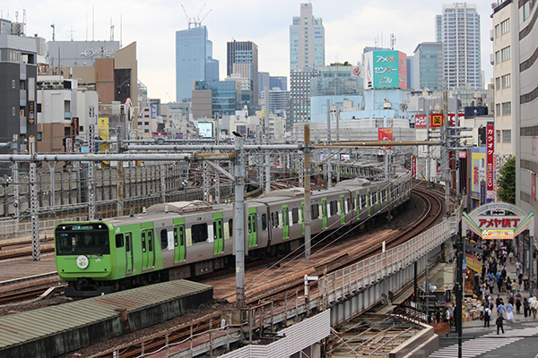 今日も多くの人で賑わうアメ横を横目に環状運転100周年の山手線の電車が走ります。