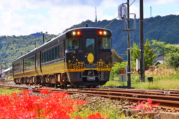 観光列車「はなあかり」が山口線を走りました。線路脇の彼岸花がまるで歓迎するかのようでした。