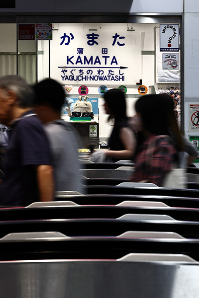 ●かつての蒲田駅の駅名標が、改札口で現代の自動改札を見守ります。