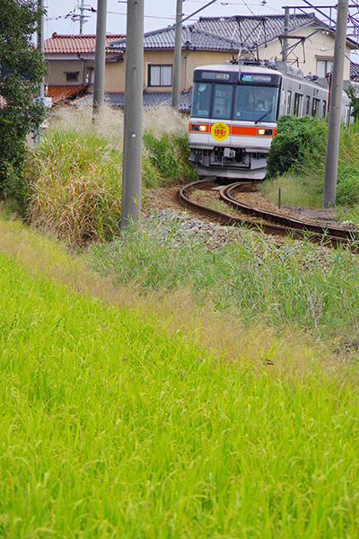 ●ススキの壁を抜けた先には、「二番穂」が実る田んぼ。ようやく秋らしい景色を見せた沿線を、「浅野川線開業100周年」記念車両が往く。