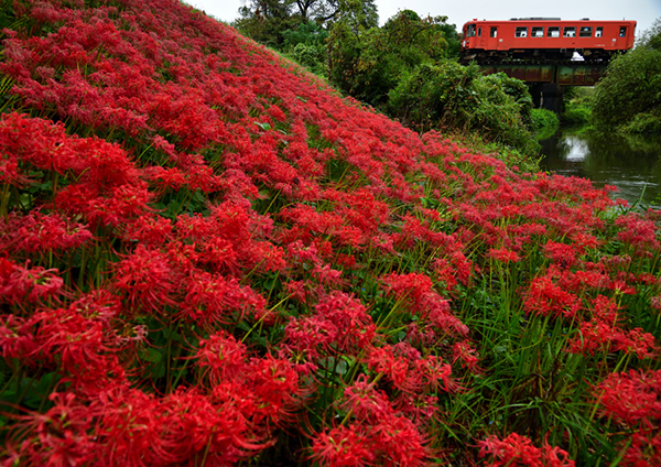 小雨ぱらつくなか満開の彼岸花にピッタリの車輌を
