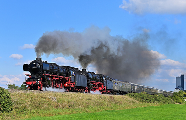 ●01型100周年イベントがドイツで開催されました。01型重連が高速で駆け抜けるシーンが撮りたくて、空路14時間かけて遠征してきました。運行2日目は天候にも恵まれ、ドイツの田舎町の非電化単線区間を高速で走り抜ける01を、撮影することができました。