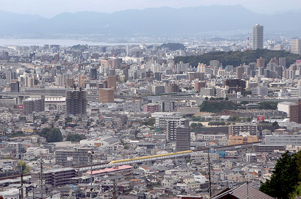 ●瀬戸内海を背にした広島市街の街並みに、普段は目立つ黄色い車体でも埋もれてしまいそう。
