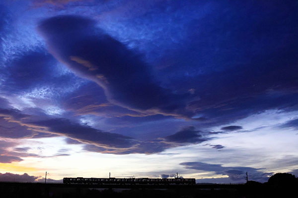 ●変わった形の雲が浮かぶ夕暮れ時、入間川橋梁を渡る209系3500番代。