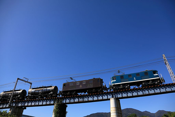 ●秋晴れに映える秩父色と復刻色の話題コンビが牽引する貨物列車。