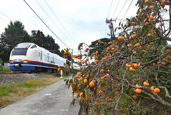 ●たわわに実った柿を見ていると古豪となった8000形が通過しました。