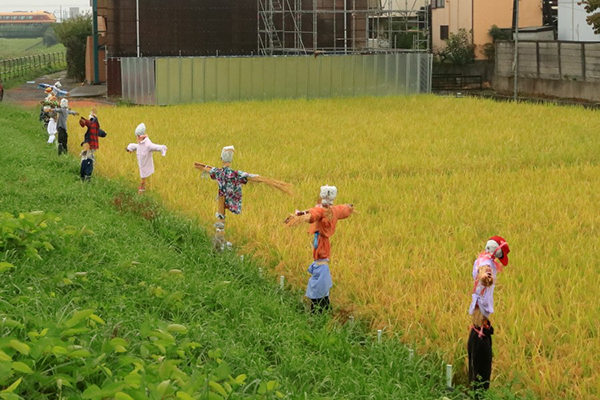 ●かかしに見送られて、特急「海浜公園コキア高尾号」。