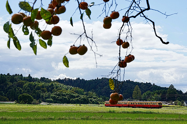 ●たわわに実る柿が色付き、そろそろ収穫の季節に。柿の木の向こうにキハ200がやって来ました。