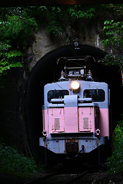 ●モーター音も高らかにトンネルから出た来たのは凸型の機関車でした