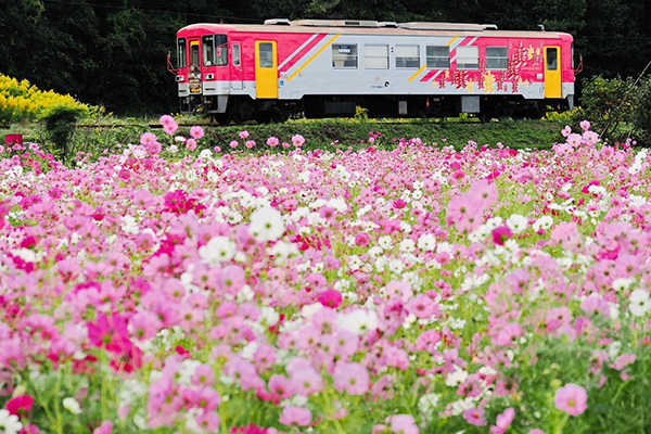 ●咲き始めたキバナコスモスの先にピンクの新幹線が照らされて輝きました。