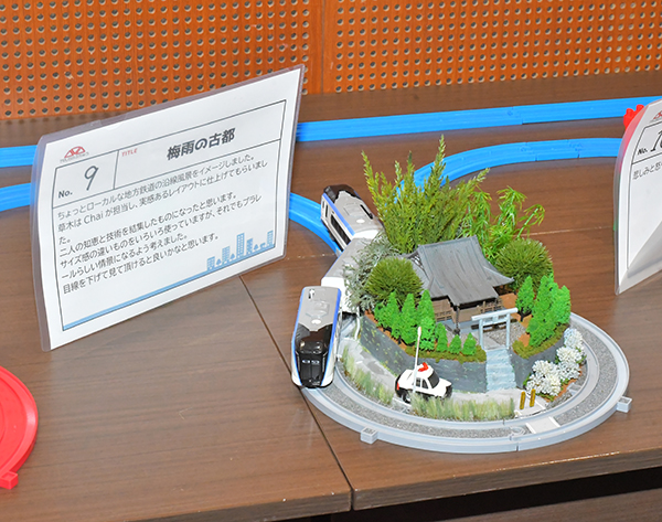 DSC_3302 神社を中心に、車両とスケール感を合わせることで自然に情景に溶け込んでいる作品。ミニジオラマのアプローチの方法として新たな可能性を感じる。 【この画像の記事に戻る】 個性的な作品展示も開催!イベントで見られた「大人の」鉄道系おもちゃファンたちの知られざる世界とは! 前の画像 次の画像