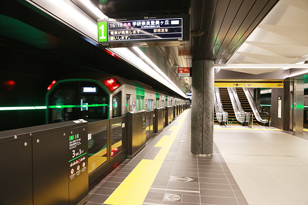 3つ並べられたエスカレーターと折り返しで発車していくOsakaMetro400系。ホームは人もまばら。