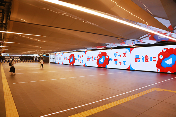 海外ブランドの広告と併せて「ミャクミャク」の映像が流れる。最後に動画を撮りに来た方もちらほら。