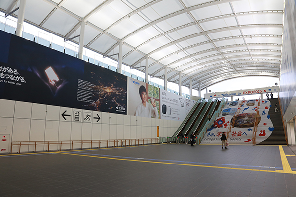 ホームからコンコースに上がり、広いコンコースを見渡すと、わずかに人がいる程度で、万博が終わったことを改めて実感しました。会期中も人気だった大型のサイネージには公式キャラクター「ミャクミャク」が踊っている映像が流れていたのが印象的です。