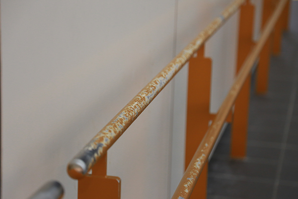 壁際の手すりは多くの人が待ち合わせなどで腰をかけたためか、塗装が剥げていた。