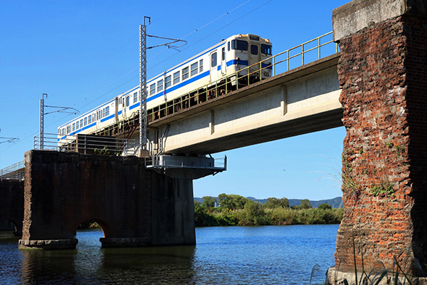 ●秋晴れの下を走る伴車のキハ40と検査入場するキハ147。遠賀川橋梁のレンガ積み橋脚は、今でも石炭輸送で栄えた筑豊地方を彷彿とさせます。