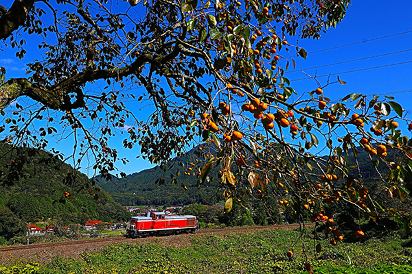 ●雲一つない青空の下、柿が実り秋本番を感じさせられました。任務を終えて戻るDE10が誇らしげでした。