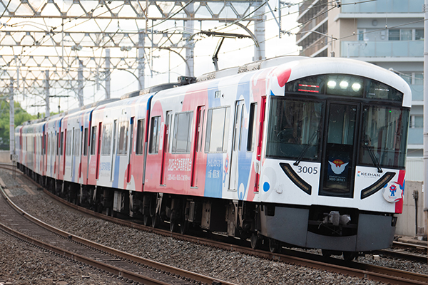 DSC_1031 京阪3000系に施されたミャクミャクラッピング。こちらは全面ラッピングの上、プレミアムカーを除くすべての車両にラッピングが施され、かなり派手な印象に。 【この画像の記事に戻る】 【ミャクミャクは今】関西でまだまだ走る大阪・関西万博ラッピング電車 いまだ人気衰えず その現状を探ってみた 前の画像