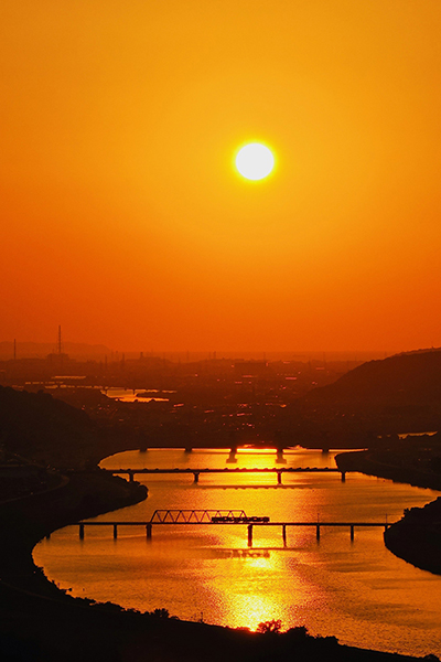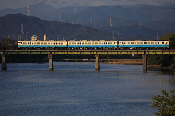 ●四国色のキハ40.47系3連が朝陽を浴びて鉄橋を渡って行った。