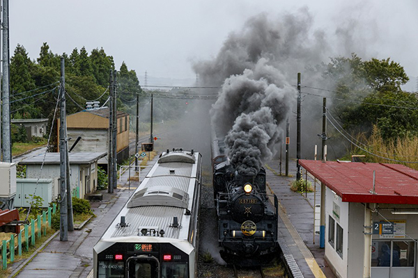●雨の中爆煙で通過します。「SLばんえつ物語号」。