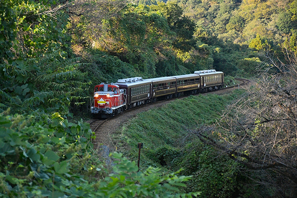 ●渡良瀬の流れから少し離れたS字カーブを行くトロッコ列車。牽引の“デーテン”、そぞろ歩きをする。