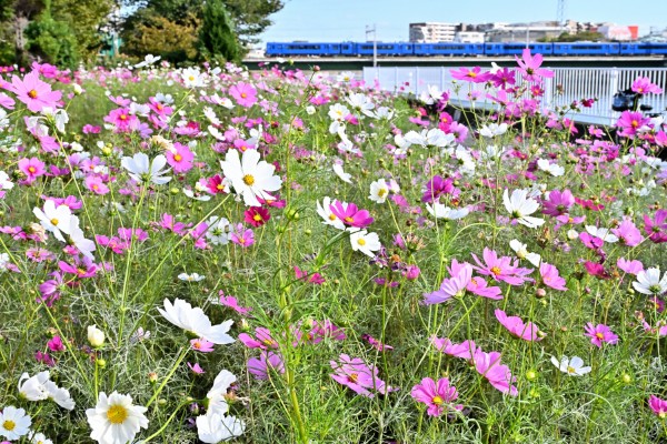 見頃を迎えたコスモスの向こうを「ブルースカイトレイン」が駆け抜けました。