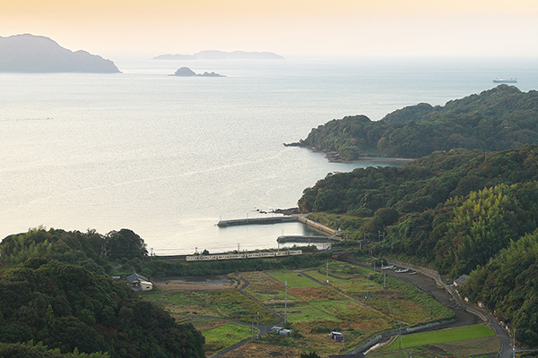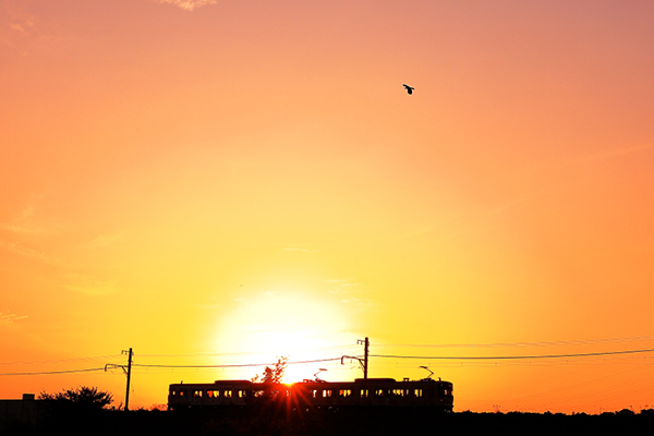 ●日没のタイミングで築堤を往くひつじ電車。野鳥も共演してくれました。