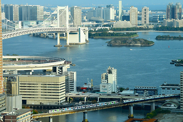 ●巨大なレインボーブリッジを背景に空港モノレールが多くの乗客を乗せて行き交います。