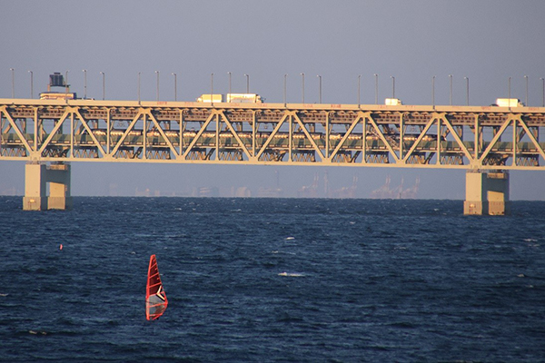 ●マリンスポーツ楽しむ大阪湾を、夕日に照らされた「ラピート」が空港連絡橋を渡る…。