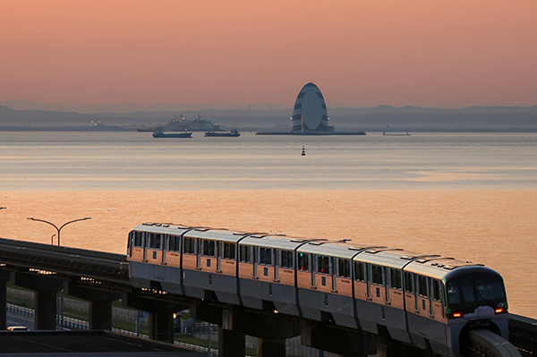 ●東の空から昇り始めた太陽が、空も海も、モノレールの車体をも、朱に染めていきました。