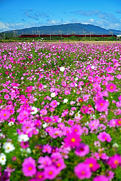 ●秋桜が満開を迎え、近鉄特急「ひのとり」号をお見送りしました。