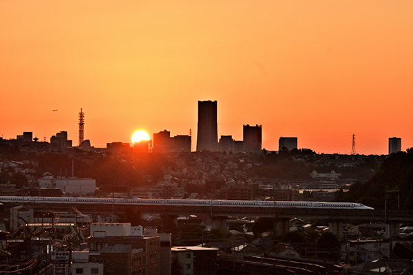 ●横浜みなとみらいから昇る太陽を背に「のぞみ99号」が西に向かいました。