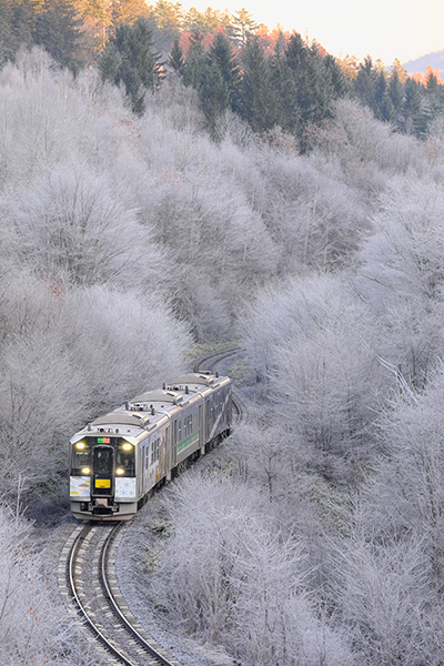 ●氷点下に冷え込み趣ある光景となった峠路。響き渡るエンジン音とともに、一番列車が現れました。