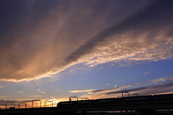 ●山の上の雲に沈みかかった太陽光を浴びて、薄っすらと黄金色に輝いて走り去りました。